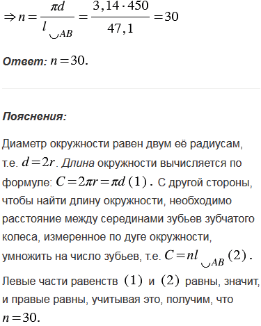 Расстояние между серединами зубьев зубчатого колеса, измеренное по дуге окружности, равно 47,1 мм. Диаметр колеса равен 450 мм. Сколько зубьев имеет колесо?