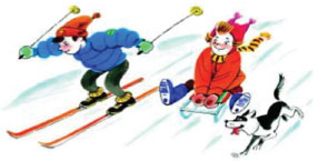 В выходной Саша и Аня отправились на прогулку. Они нашли высокую горку, чтобы кататься с неё. Саша нёсся с верхушки горы на лыжах, а Аня старалась обогнать его на санках. Рядом с ребятами бежал их верный друг - пёс Барбос.